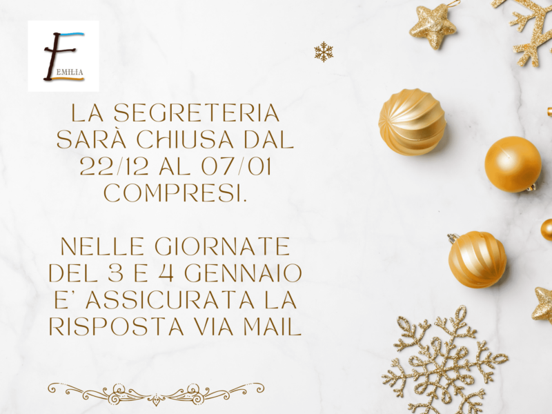 Chiusura segreteria nel periodo natalizio LA SEGRETERIA SARA’ CHIUSA PER LE FESTIVITA’ NATALIZIE DAL 22/12 AL 07/01 COMPRESI NELLE GIORNATE DEL 3 E DEL 4 GENNAIO E’ ASSICURATA LA RISPOSTA VIA MAIL FacebookTwitterLinkedin