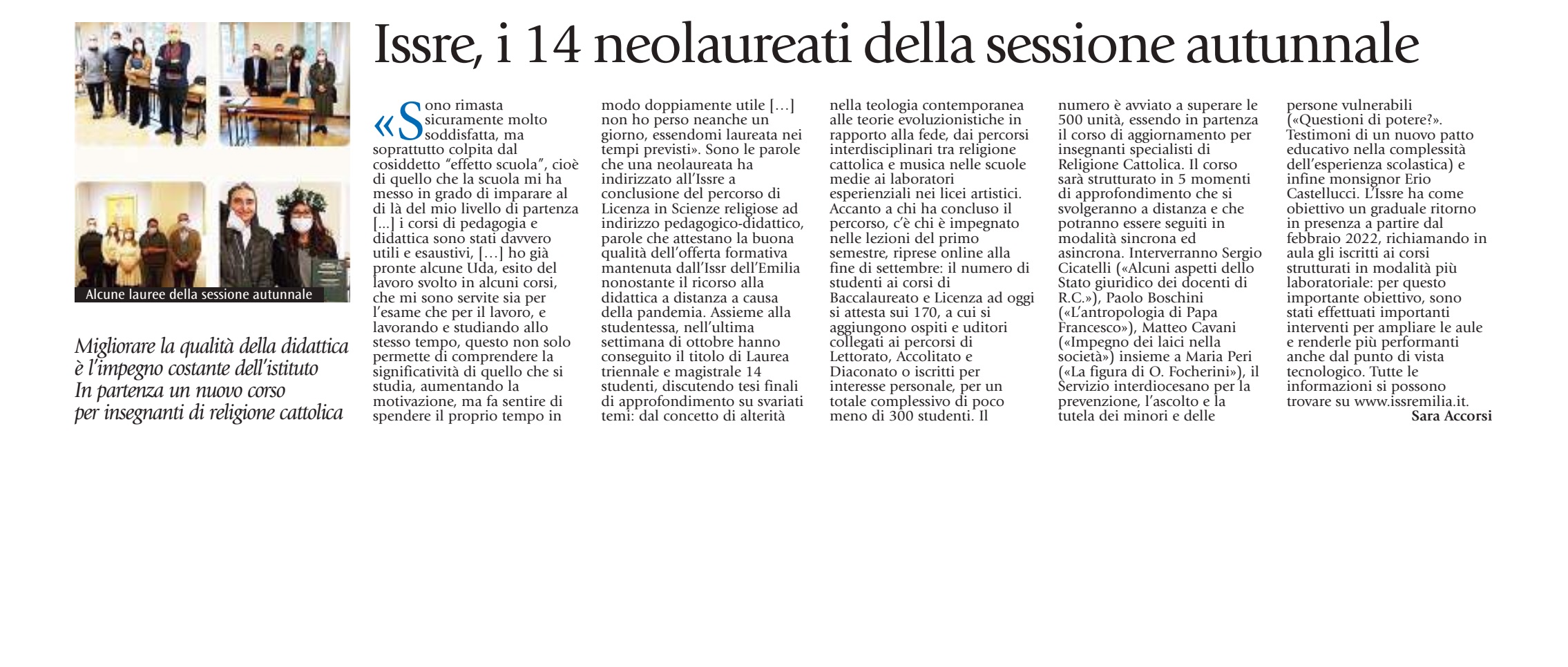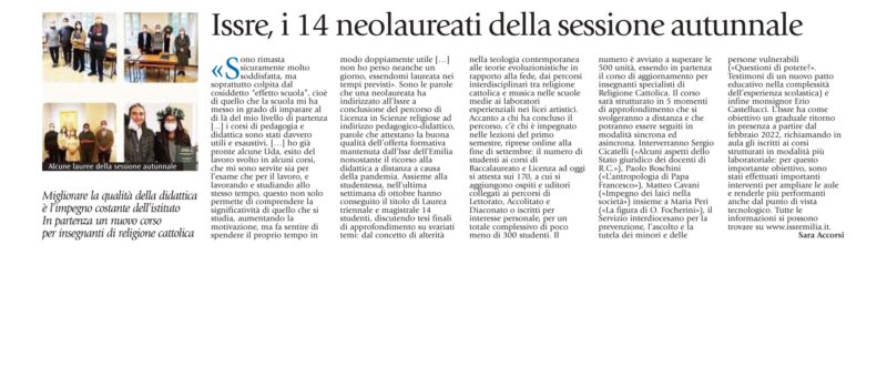 Nuovo articolo su Nostro Tempo di domenica 14 novembre per l’ISSRE: si parla di laureati, di lezioni, di Scuola di formazione teologica e del Corso di aggiornamento per docenti specialisti di RC che è in procinto di iniziare con l’intervento del prof. Cicatelli.